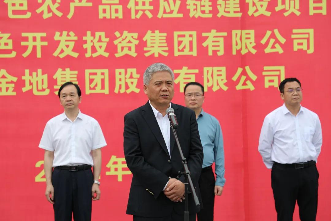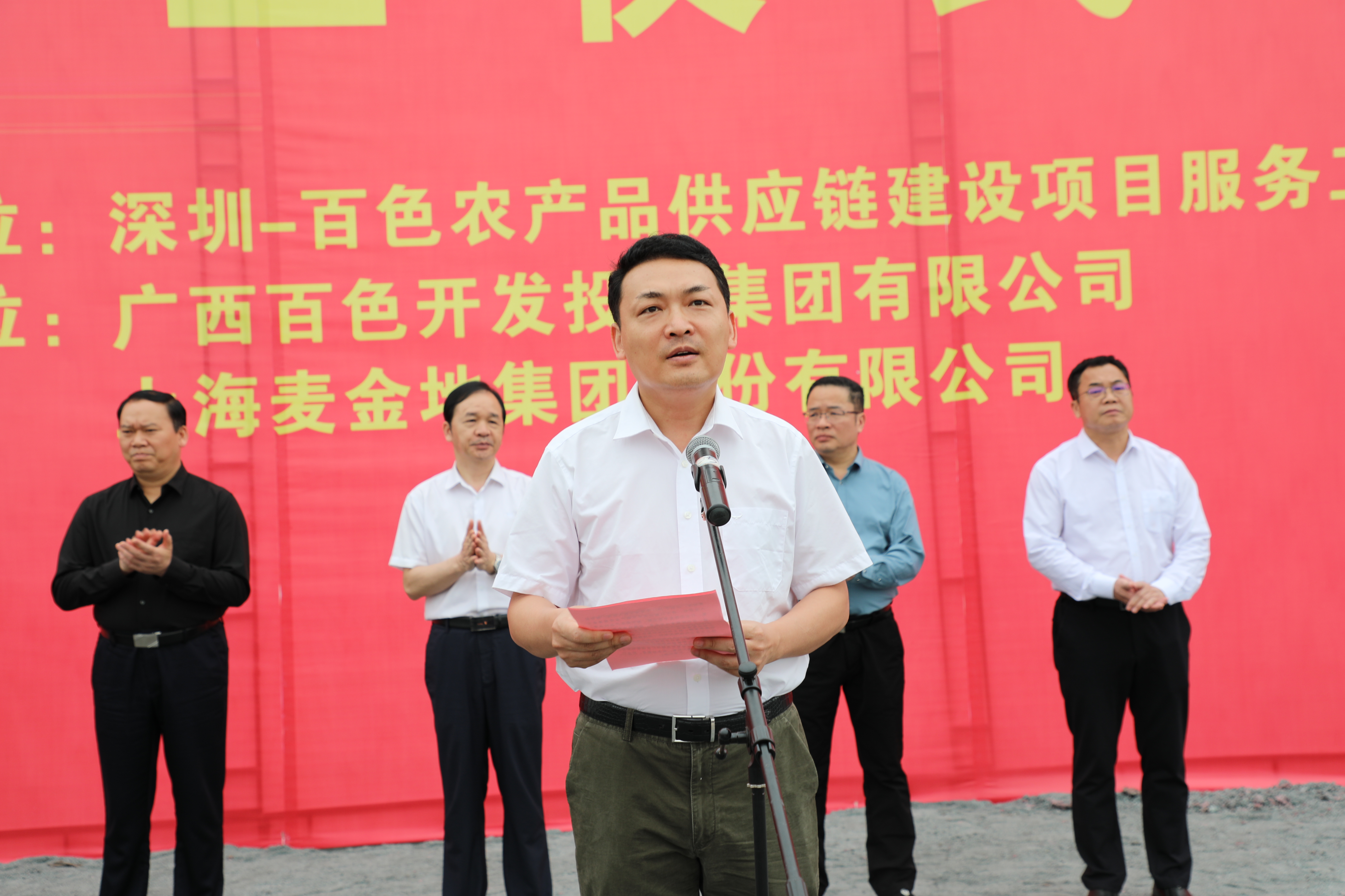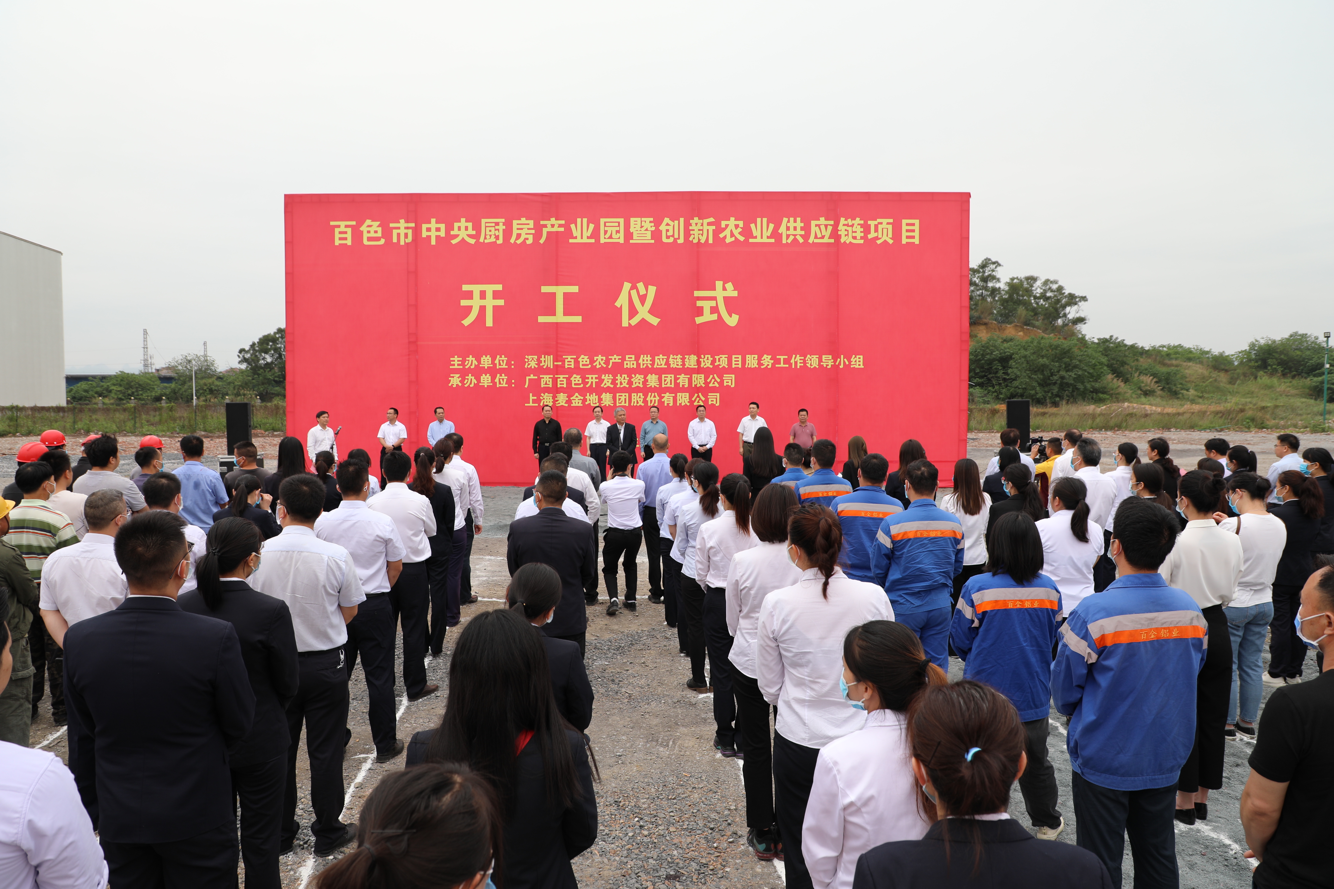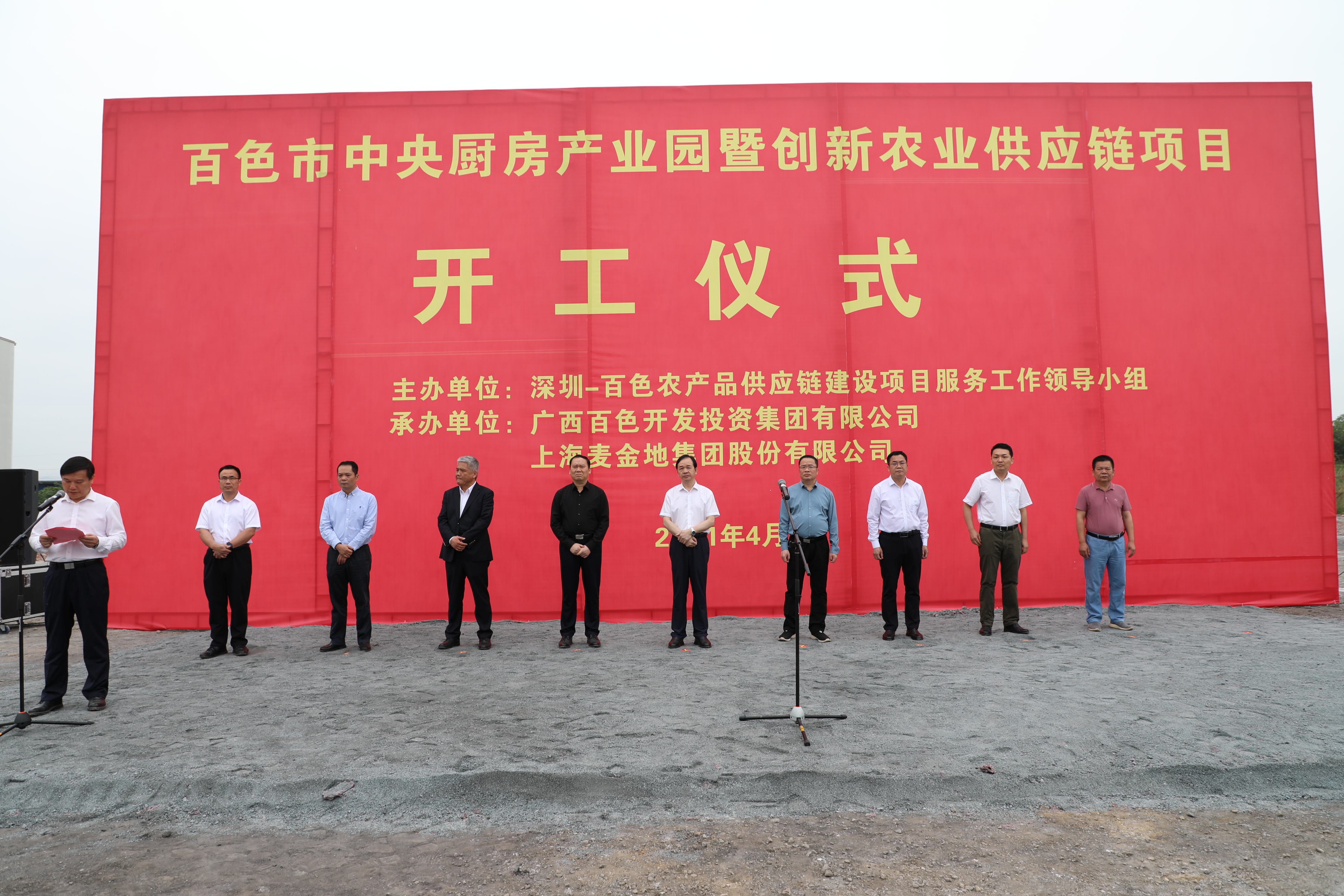 4月28日, 百色市中央廚房產(chǎn)業(yè)園暨創(chuàng)新農(nóng)業(yè)供應(yīng)鏈項(xiàng)目開工儀式在百色一號(hào)舉行,市人大常委會(huì)主任、黨組書記、深圳—百色農(nóng)產(chǎn)品供應(yīng)鏈建設(shè)項(xiàng)目服務(wù)工作領(lǐng)導(dǎo)小組組長(zhǎng)周武紅出席開工儀式并宣布項(xiàng)目開工,上海麥金地集團(tuán)股份有限公司董事長(zhǎng)孔德順介紹情況,廣西百色開發(fā)投資集團(tuán)有限公司董事長(zhǎng)華東介紹項(xiàng)目基本情況。百色市人民政府副市長(zhǎng)藍(lán)樹東主持開工儀式。